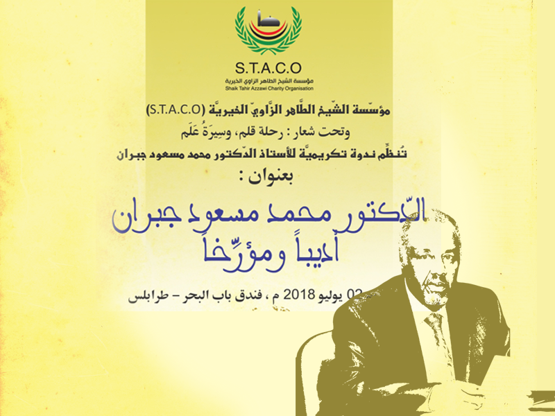 The Sheikh Taher Al-Zawi Charitable Foundation (STACO) is holding its honoring symposium for distinguished Libyan personalities, in its first session, in which it chose Prof. Dr. Muhammad Masoud Gibran, may God grant him health and wellness, as a personality for this symposium under the title “Dr. Muhammad Masoud Gibran, a writer and historian”, and under the slogan “ Journey of a pen, and the biography of knowledge.”