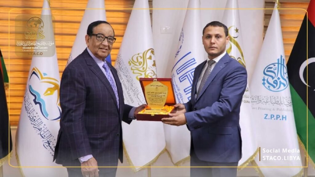 As part of its appreciation for the national figures who contributed to establishing the foundation, the Sheikh Taher Al-Zawi Charitable Foundation honored Sheikh Hussein Al-Taher Al-Zawi, son of the distinguished scholar Sheikh Taher Al-Zawi, and his grandson, Professor Ahmed Al-Hadi Al-Taher Al-Zawi, this Monday morning, during their visit to the foundation’s headquarters in Tripoli.